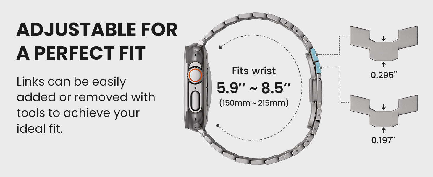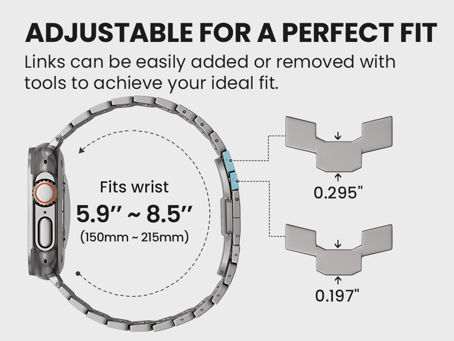 Adjustable Size for Most Wrists – Fits wrists 150–215mm (5.9–8.5"). Includes a link removal tool for quick and easy resizing.